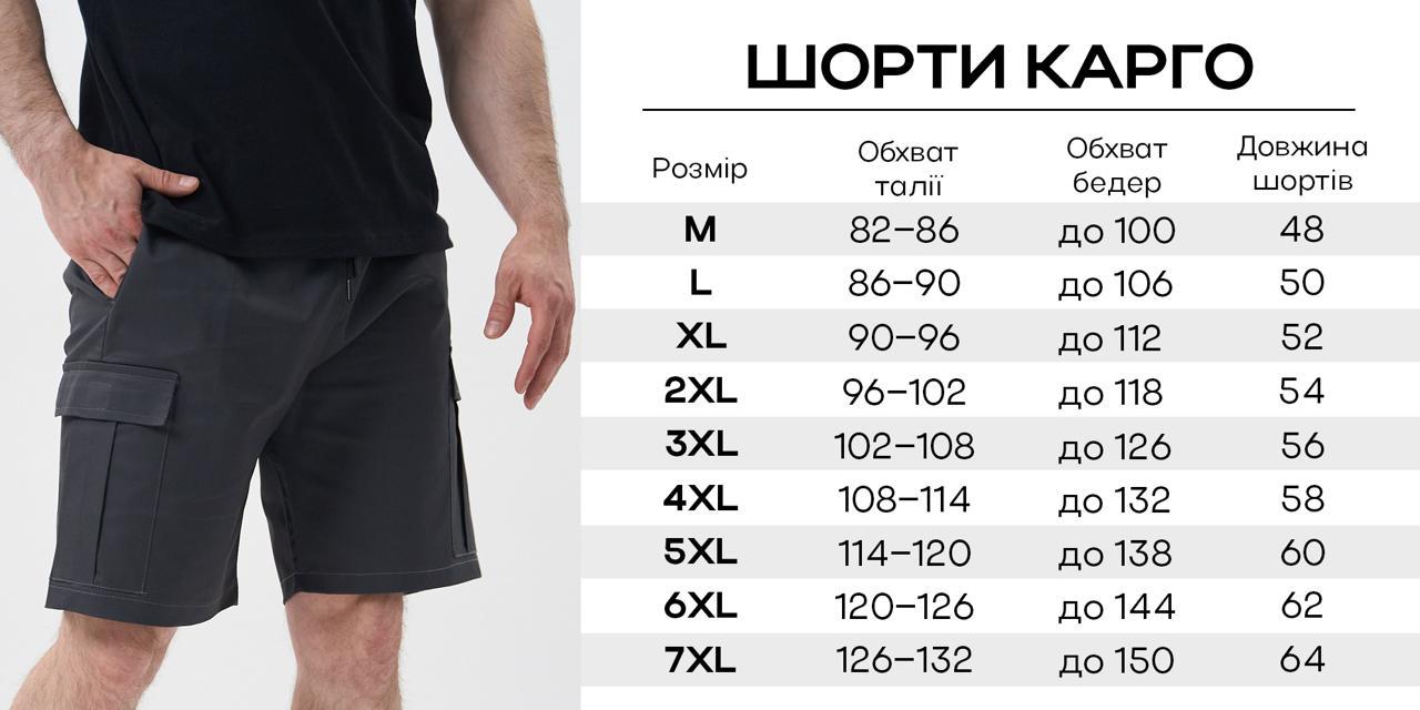 Шорти Cargo чоловічі великі розміри 4XL–7XL, графітові – ідеальний вибір для тих, хто цінує комфорт, функціональність та стиль у будь-якій ситуації. Модель виконана у популярному форматі Cargo з місткими накладними кишенями, що робить їх зручними для подорожей, відпочинку на природі, прогулянок або повсякденного носіння.