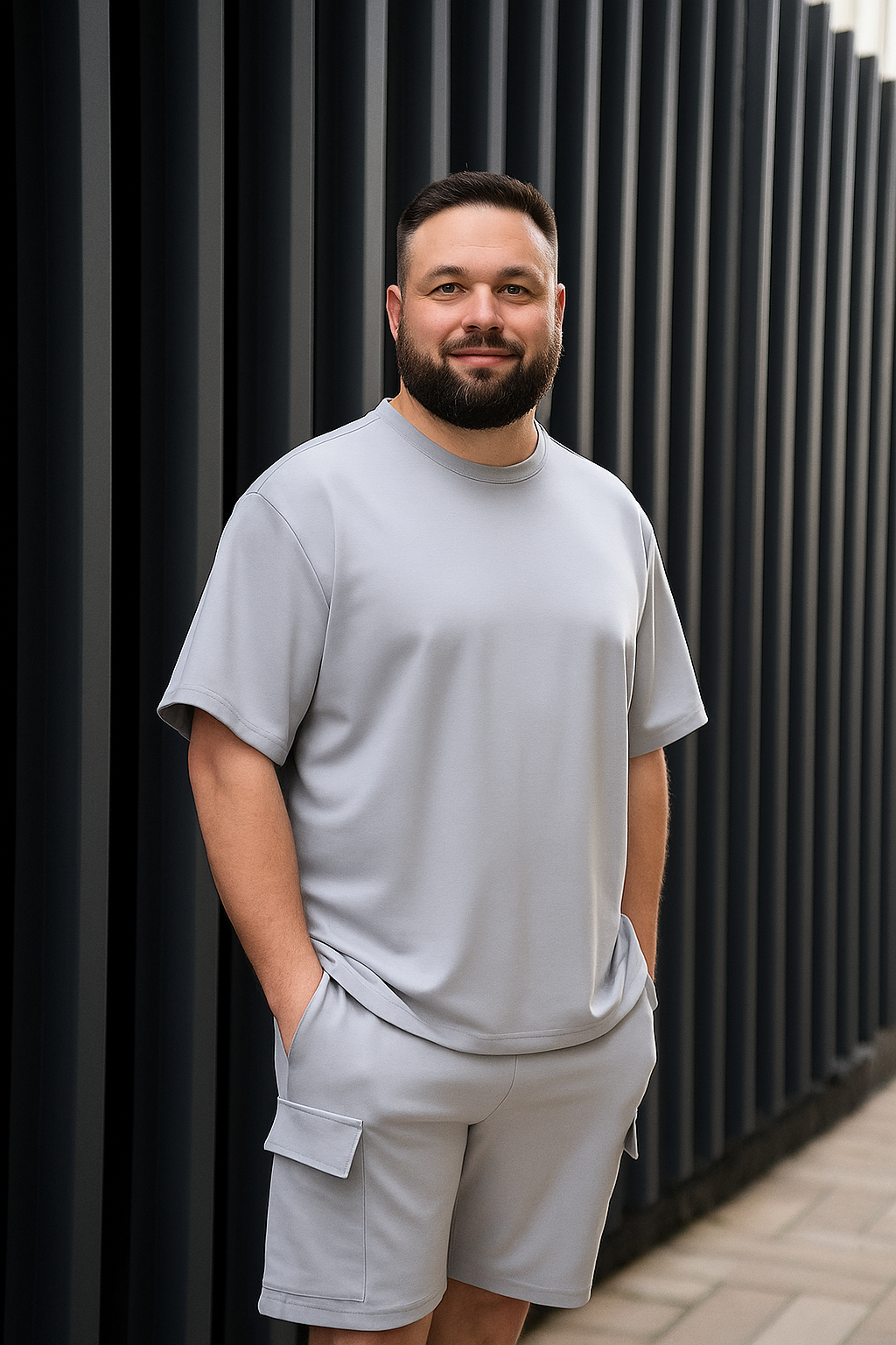 Стильний і зручний чоловічий костюм FLEX plus size — універсальне рішення для активного літнього дня. У комплект входять футболка вільного крою та шорти карго з місткими кишенями, що робить костюм ідеальним для прогулянок, подорожей та повсякденного носіння.